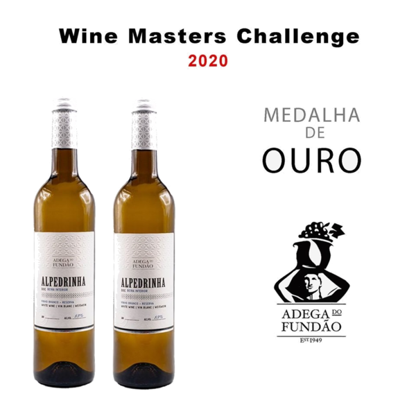 Duas garrafas de vinho branco Alpedrinha com rótulos brancos e texto preto, com tampa branca e medalha de ouro Wine Master's Challenge 2020