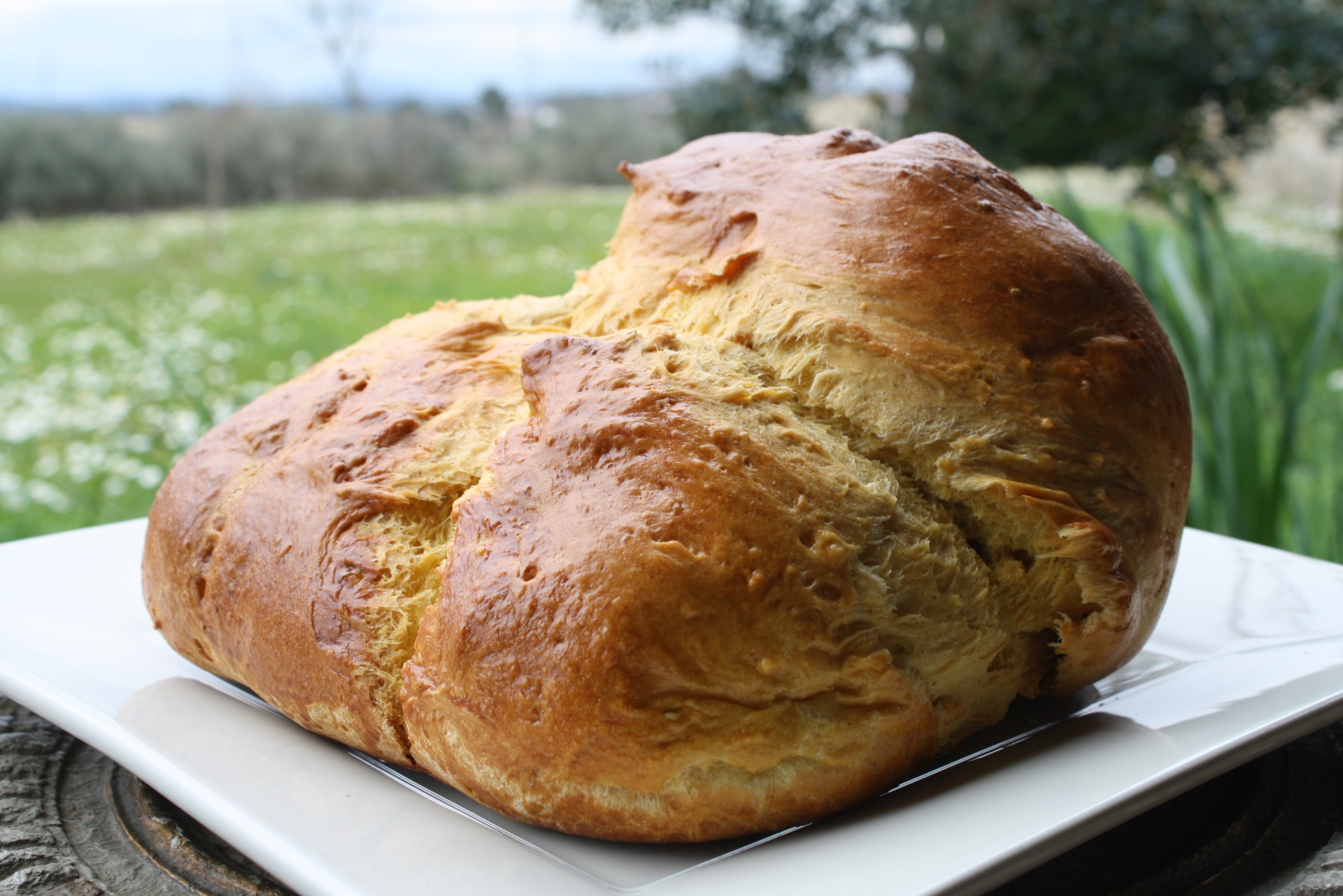 Pão caseiro redondo com crosta dourada num prato branco ao ar livre