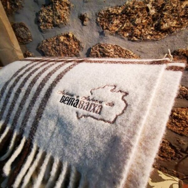 Cobertor cinza claro com franjas e bordado 'Beira Baixa'