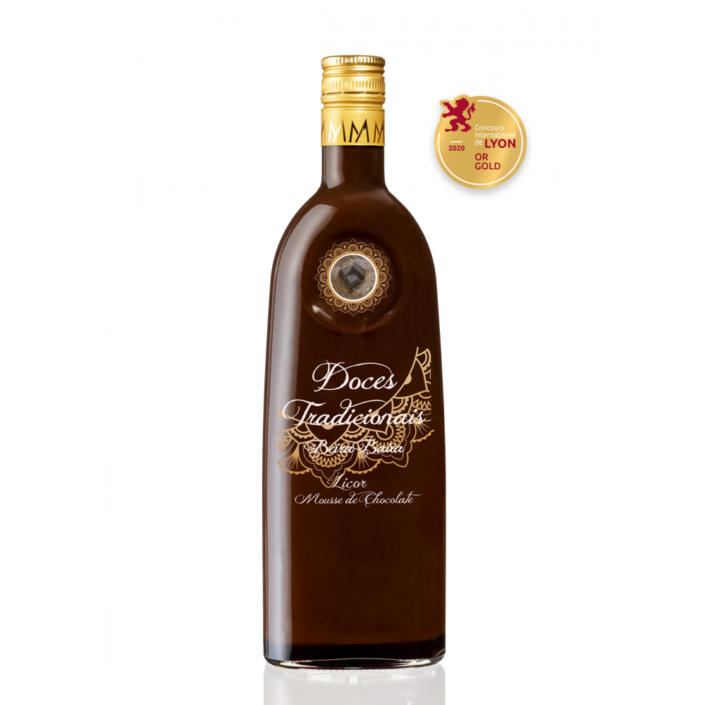Garrafa de licor mousse de chocolate com rótulo dourado e selo de qualidade.