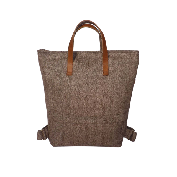 \nMochila de burel. Forrada, com dois bolsos interiores e compartimento para transportar o notebook ou iPad. Bolso exterior. Pegas de mão em pele na parte superior e alças ajustáveis. Fecho-éclair.