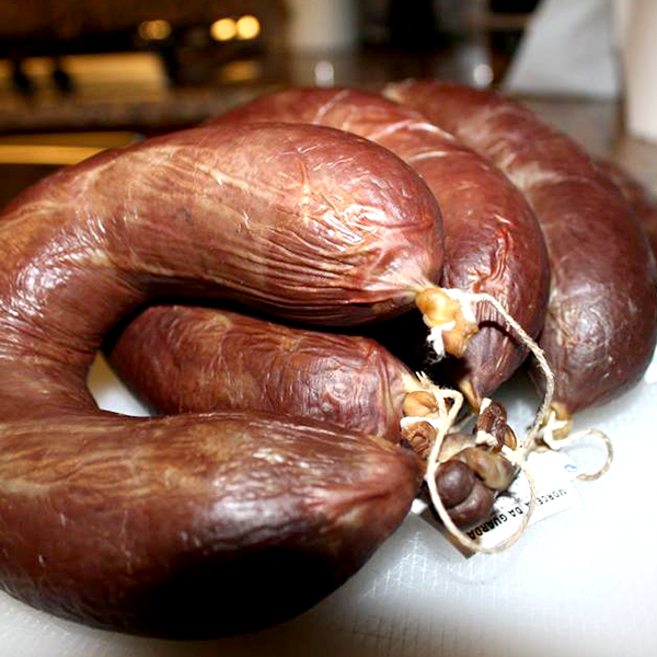 Morcela típica da Guarda, de cor castanho escuro, cheiro e sabor sui-generis e de aspecto fumado, brilhante, em forma de ferradura e medianamente mole. Embalada a vácuo. \n \nIngredientes: pão de trigo (farinha T65, fermento, melhorante E170/E330, enzimas); sangue; gordura de porco; cebola; cominhos; sal; salsa e piri-piri. \n \nAlergénios: glúten \n \nConsumir cozinhado. \n \nEmb. de 2 unid. \n \nPeso aprox. 720g