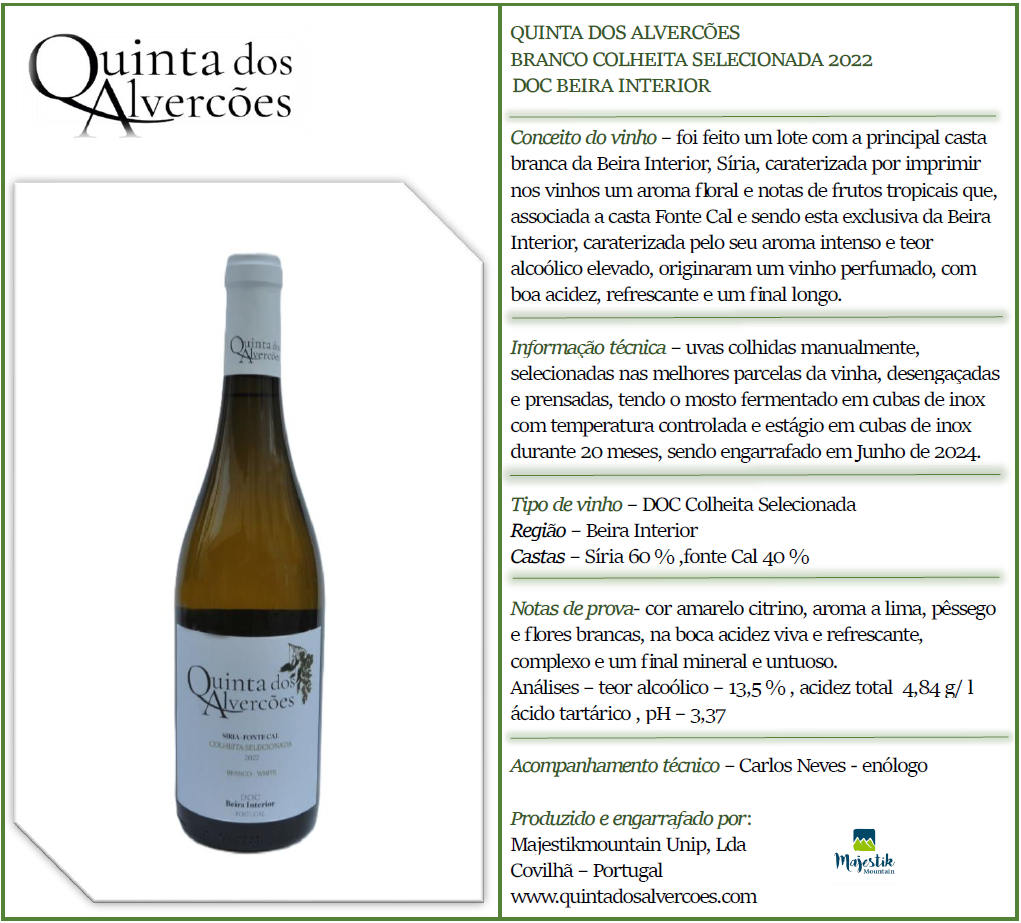 Informação técnica - uvas colhidas manualmente, selecionadas nas melhores parcelas da vinha, desengaçadas e prensadas, tendo o mosto fermentado em cubas inox com temperatura controlada durante 20 meses, sendo engarrafado em Junho de 2024.