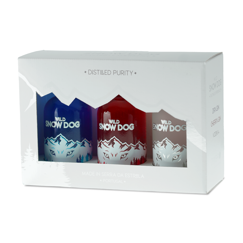 Caixa-oferta com três garrafas de 100ml de cada uma das variedades disponíveis - Wild Snow Dog Dry Gin, Wild Snow Dog Cherry Gin e Wild Snow Dog Vodka.